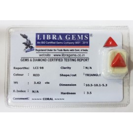 REPORT NO . LCI 98CLARITY . N/ACOLOUR . REDSHAPE / CUT . TRIANGLEWT . 3.42 CTSDIMENSION . 10-5.10-1.5-3.R . INDEX . N/AHARDNESS . 3.5COMMENT . CORAL..