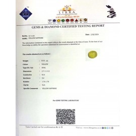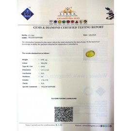 REPORT.NO.-LY 478CLARITY.-N/ACOLOUR.-YELLOWSHAPE/CUT.-OVALWT.-4.93 CTSDIMENSION.-10-8.8-7.5-7.R.INDEX.-1.76-1.78HARDNESS.-9.0COMMENT.-YELLOW SAPPHIRE..