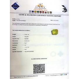 REPORT.NO.LYA 78CLARITY.N/ACOLOUR.YELLOWSHAPE/CUT.RECTANGLEWT.4.66 CTSDIMENSION.9.8-7.6-5.2R.INDEX.1.76-1.78HARDNESS.9.0COMMENT.YELLOW SAPPHIRE {A}..