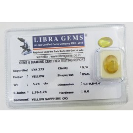 REPORT.NO.LYA 273CLARITY.N/ACOLOUR.YELLOW SHAPE/CUT.OVALWT.5.74 CTSDIMENSION.3.3-9.8-4.4R.INDEX.1.76-1.78HARDNESS.9.0COMMENT.YELLOW SAPPHIRE {A}..