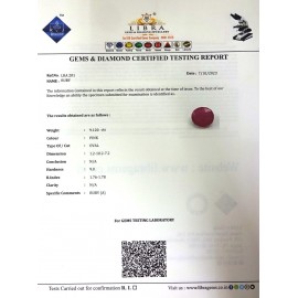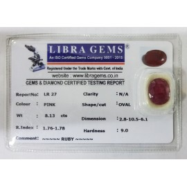 REPORT NO . LR 27CLARITY . N/ACOLOUR . PINKSHAPE / CUT . OVALWT . 8.13 CTSDIMENSION . 2-8.10-5.6-1.R . INDEX . 1.76-1.78HARDNESS . 9.0COMMENT . RUBY..