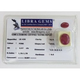 REPORT.NO.-LR 430CLARITY.-N/ACOLOUR.-PINKSHAPE/CUT.-OVALWT.-6.97 CTSDIMENSION.-3-5.10-8.4-6.R.INDEX.-1.76-1.78HARDNESS.-9.0COMMENT.-RUBY..
