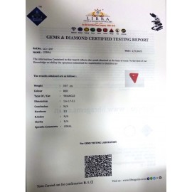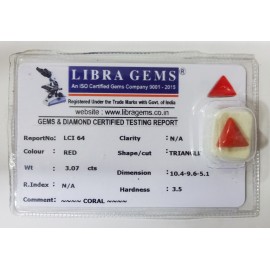 REPORT NO . LCI 64CLARITY . N/ACOLOUR . REDSHAPE / CUT . TRIANGLEWT . 3.07 CTSDIMENSION . 10-4.9-6.5-1.R . INDEX . N/AHARDNESS . 3.5COMMENT . CORAL..