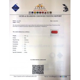 REPORT.NO.LCI 765CLARITY.N/ACOLOUR.REDSHAPE/CUT.CAPSULE WT.5.21 CTSDIMENSION.6.6-6.6-5.5R.INDEX.N/AHARDNESS.3.5COMMENT.CORAL..