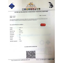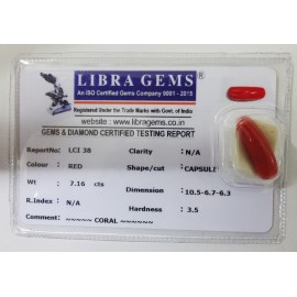REPORT NO. 38CLALITY. N/ACOLOUR. REDSHAPE/CUT. CAPSULEWT. 7.16 CTSDIMENSION. 10.5-6.7-6.3R, INDEX. N/AHARDNESS. 3.5COMMENT. CORAL..