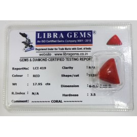 REPORT.NO.LCI 419CLARITY.N/ACOLOUR.REDSHAPE/CUT.TRIANGLEWT.17.95 CTSDIMENSION.6.8-5.1-10.8R.INDEX.N/AHARDNESS.3.5COMMENT.CORAL..