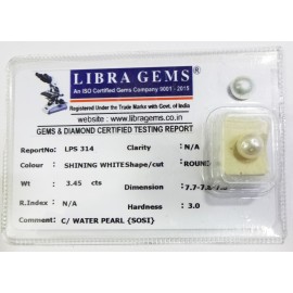 REPORT.NO.-LPS 314CLARITY.-N/ACOLOUR.-SHINING WHITESHAPE/CUT.-ROUNDWT.-3.45 CTSDIMENSION.-7-7.7-8.7-8.R.INDEX.-N/AHARDNESS.-3.0COMMENT.-C / WATER PEARL { SOSI }..