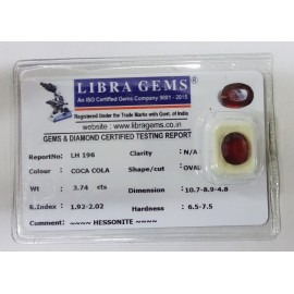 REPORT NO . LH 196CLARITY . N/ACOLOUR . COCA COLASHAPE / CUT . OVALWT . 3.74 CTSDIMENSION . 10-7.8-9.4-8.R . INDEX . 1.92-2.02HARDNESS . 6.5-7.5COMMENT . HESSONITE..