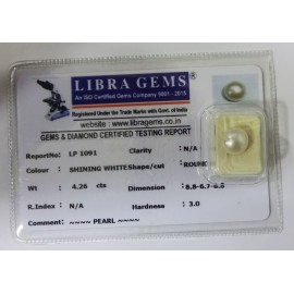 REPORT NO . LP 1091CLARITY . N/ACOLOUR . SHINING WHITESHAPE / CUT . ROUNDWT . 4.26 CTSDIMENSION . 8-8.6-7.8-8.R . INDEX . N/AHARDNESS . 3.0COMMENT . PEARL..