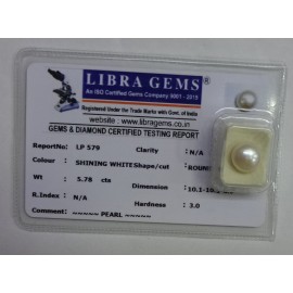 REPORT NO . LP 579CLARITY . N/ACOLOUR . SHINING WHITESHAPE / CUT . ROUNDWT . 5.78 CTSDIMENSION . 10-1.10-1.6-9.R . INDEX . N/AHARDNESS . 3.0COMMENT . PEARL..