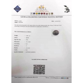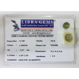 REPORT NO . LC 89CLARITY . N/ACOLOUR . L . GREENSHAPE / CUT . ROUNDWT . 3.57 CTSDIMENSION . 9-7.9-3.5-6.R . INDEX . 1.54-1.55HARDNESS . 7.5COMMENT . CATS EYE { S . SQUARTZ }..