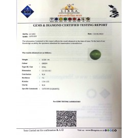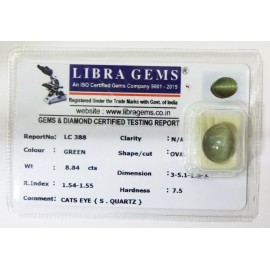 REPORT.NO.-LC 388CLARITY.-N/ACOLOUR.-GREENSHAPE/CUT.-OVALWT.-8.84 CTSDIMENSION.-3-5.1-1.8-3.R.INDEX.-1.54-1.55HARDNESS.-7.5COMMENT.-CATS EYE { S . QUARTZ }..