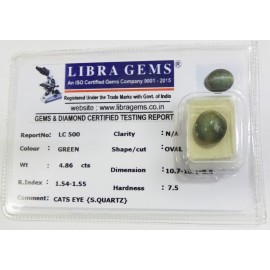 REPORT.NO.-LC 500CLARITY.-N/ACOLOUR.-GREENSHAPE/CUT.-OVALWT.-4.86 CTSDIMENSION.-10-7.10-1.6-4.R.INDEX.-1.54-1.55HARDNESS.-7.5COMMENT.-CATS EYE { S . QUARTZ }..