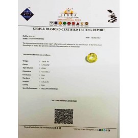 REPORT.NO.LYA 66CLARITY.N/ACOLOUR.YELLOWSHAPE/CUT.OVALWT.7.90 CTSDIMENSION.3.1-10.3-6.1R.INDEX.1.76-1.78HARDNESS.9.0COMMENT.YELLOW SAPPHIRE {A}..