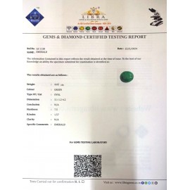 REPORT.NO.- LE 172CLARITY.- N/ACOLOUR.- GREENSHAPE/CUT.- OVALWT.- 3.30 CTSDIMENSION.- 2-9.9-8.3-7.R.INDEX.- 1.57HARDNESS.- 7.5COMMENT.- EMERALD..