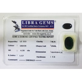 REPORT.NO.-LE 333CLARITY.-N/ACOLOUR.-GREENSHAPE/CUT.-OVALWT.-4.30 CTSDIMENSION.-4.4-9.6-4.4R.INDEX.-1.57HARDNESS.-7.5COMMENT.-EMERALD..