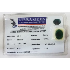 REPORT NO . LE 4CLARITY . N/ACOLOUR . GREENSHAPE / CUT . OVALWT . 5.53 CTSDIMENSION . 3-5.10-4.5-6.R . INDEX . 1.57HARDNESS . 7.5COMMENT . EMERALD..