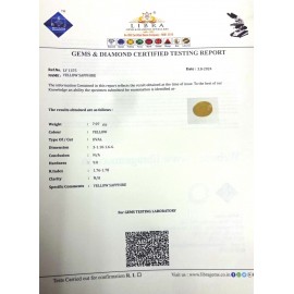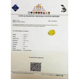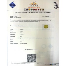 DATE:4-7-2024REF.NO:LY 1232NAME:YELLOW SAPPHIREWEIGHT:5.48 CTSCOLOUR:YELLOWTYPE OF/CUT:OVALDIMENSION:1.2-9.4-5.2CONCLUSION:N/AHARDNESS:9.0R.INDEX:1.76-1.78CLARITY:N/ASPECIFIC COMMENTS:YELLOW..
