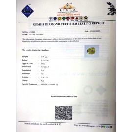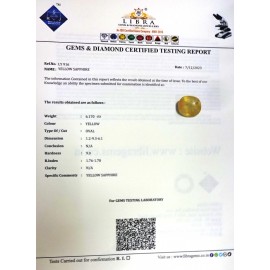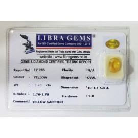 REPORT NO . LY 285CLARITY . N/ACOLOUR . YELLOWSHAPE / CUT . OVALWT . 3.43 CTSDIMENSION . 10-1.7-5.4-4.R . INDEX . 1.76-1.78HARDNESS . 9.0COMMENT . YELLOW SAPPHIRE..