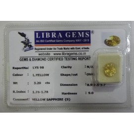 REPORT.NO.-LYS 98CLARITY.-N/ACOLOUR.-L . YELLOWSHAPE/CUT.-OVALWT.-3.20 CTSDIMENSION.-8-9.7-5.5-7.R.INDEX.-1.76-1.78HARDNESS.-9.0COMMENT.-YELLOW SAPPHIRE { S }..