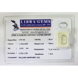 REPORT.NO.-LYS 64CLARITY.-N/ACOLOUR.-L.YELLOWSHAPE/CUT.-OVALWT.-4.02 CTSDIMENSION.-1.5-7.8-3.7R.INDEX.-1.76-1.78HARDNESS.-9.0COMMENT.-YELLOW SAPPHIRE {S}..