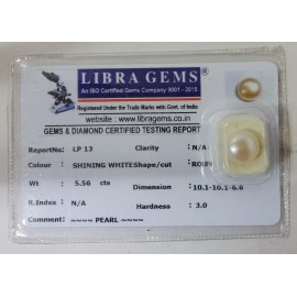 REPORT NO . LP 13CLARITY . N/ACOLOUR . SHINING WHITESHAPE / CUT . ROUNDWT . 5.56 CTSDIMENSION . 10-1.10-1.6-6.R . INDEX . N/AHARDNESS . 3.0COMMENT . PEARL..