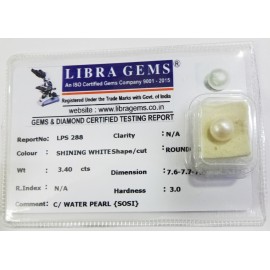 REPORT.NO.-LPS 288CLARITY.-N/ACOLOUR.-SHINING WHITESHAPE/CUT.-ROUNDWT.-3.40 CTSDIMENSION.-7-6.7-7.7-8.R.INDEX.-N/AHARDNESS.-3.0COMMENT.-C / WATER PEARL { SOSI }..
