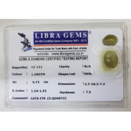 REPORT NO . LC 111CLARITY . N/ACOLOUR . L . GREENSHAPE / CUT . OVALWT . 6.72 CTSDIMENSION . 2-7.10-2.7-2.R . INDEX . 1.54-1.55HARDNESS . 7.5COMMENT . CATS EYE { S . QUARTZ }..