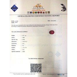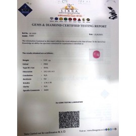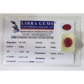 REPORT NO . LR 230CLARITY . N/ACOLOUR . PINKSHAPE / CUT . OVALWT . 4.78 CTSDIMENSION . 10-8.8-5.5-5.R . INDEX . 1.76-1.78HARDNESS . 9.0COMMENT . RUBY..