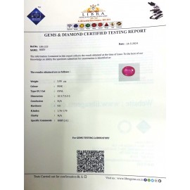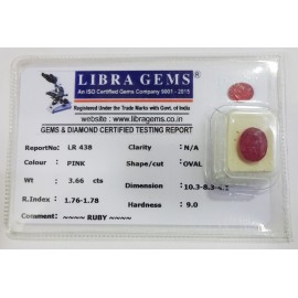 REPORT.NO.-LR 438CLARITY.-N/ACOLOUR.-PINKSHAPE/CUT.-OVALWT.-3.66 CTSDIMENSION.-10-3.8-3.4-1.R.INDEX.-1.76-1.78HARDNESS.-9.0COMMENT.-RUBY..