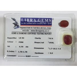 REPORT NO . LR 90CLARITY . N/ACOLOUR . PINKSHAPE / CUT . OVALWT . 9.70 CTSDIMENSION . 1-7.10-1.7-9.R . INDEX . 1.76-1.78HARDNESS . 9.0COMMENT . RUBY..