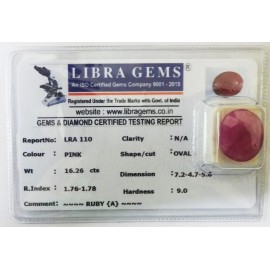 REPORT.NO.-LRA 110CLARITY.-N/ACOLOUR.-PINKSHAPE/CUT.-OVALWT.-16.26 CTSDIMENSION.-7-2.4-7.5-6.R.INDEX.-1.76-1.78HARDNESS.-9.0COMMENT.-RUBY { A }..