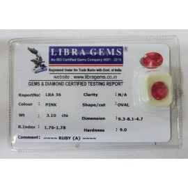 REPORT NO . LRA 36CLARITY . N/ACOLOUR . PINKSHAPE / CUT . OVALWT . 3.10 CTSDIMENSION . 9-3.8-1.4-7.R . INDEX . 1.76-1.78HARDNESS . 9.0COMMENT . RUBY { A }..
