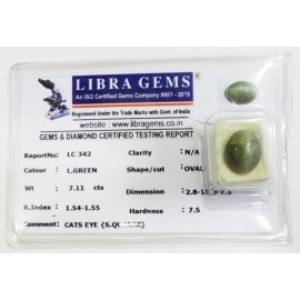REPORT.NO.-LC 342CLARITY.-N/ACOLOUR.-L . GREENSHAPE/CUT.-OVALWT.-7.11 CTSDIMENSION.-2-8.10-6.7-5.R.INDEX.-1.54-1.55HARDNESS.-7.5COMMENT.-CATS EYE { S . QUARTZ }..