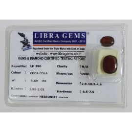 REPORT.NO.-LH 390CLARITY.-N/ACOLOUR.-COCA COLASHAPE/CUT.-OVALWT.-5.60 CTSDIMENSION.-2-9.10-3.4-6.R.INDEX.-1.92-2.02HARDNESS.-6.5-7.5COMMENT.-HESSONITE..