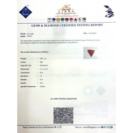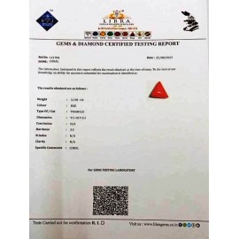 REPORT NO . LCI 95CLARITY . N/ACOLOUR . REDSHAPE / CUT . TRIANGLEWT . 3.51 CTSDIMENSION . 10-8.10-1.5-4.R . INDEX . N/AHARDNESS . 3.5COMMENT . CORAL..