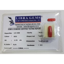 REPORT.NO.LCI 498CLARITY.N/ACOLOUR.REDSHAPE/CUT.CAPSULEWT.3.70 CTSDIMENSION.5.8-5.2-4.9R.INDEX.N/AHARDNESS.3.5COMMENT.CORAL..