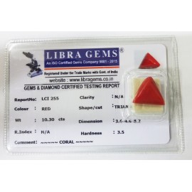 REPORT NO . LCI 255CLARITY . N/ACOLOUR . REDSHAPE / CUT . TRIANGLEWT . 10.30 CTSDIMENSION .3-6.4-6.8-2.R . INDEX . N/AHARDNESS . 3.5COMMENT . CORAL..