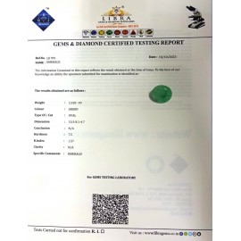 REPORT.NO.-LE 215CLARITY.-N/ACOLOUR.-GREENSHAPE/CUT.-OVALWT.-5.30 CTSDIMENSION.-3-2.10-2.5-3.R.INDEX.-1.57HARDNESS.-7.5COMMENT.-EMERALD..