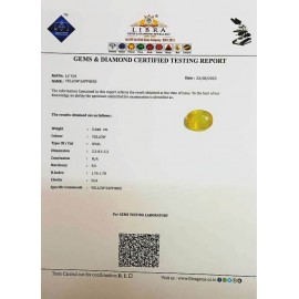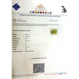 REPORT NO . LY 171CLARITY . N/ACOLOUR . YELLOWSHAPE / CUT . OVALWT . 4.10 CTSDIMENSION . 10-3.8-3.5-1.R . INDEX . 1.76-1.78HARDNESS . 9.0COMMENT . YELLOW SAPPHIRE..