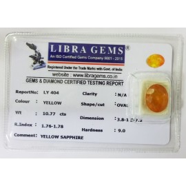 REPORT.NO.LY 404CLARITY.N/ACOLOUR.YELLOWSHAPE/CUT.OVALWT.10.77 CTSDIMENSION.3.8-1.2-7.2R.INDEX.1.76-1.78HARDNESS.9.0COMMENT.YELLOW SAPPHIRE..