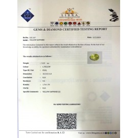 REPORT.NO.-LYS 130CLARITY.-N/ACOLOUR.-L. YELLOWSHAPE/CUT.-OVALWT.-4.52 CTSDIMENSION.-1-8.8-5.4-3.R.INDEX.-1.76-1.78HARDNESS.-9.0COMMENT.-YELLOW SAPPHIRE { S }..