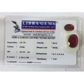 REPORT NO . LR 70CLARITY . N/ACOLOUR . PINKSHAPE / CUT . OVALWT . 10.33 CTSDIMENSION . 4-7.1-5.6-3.R . INDEX . 1.76-1.78HARDNESS . 9.0COMMENT . RUBY..