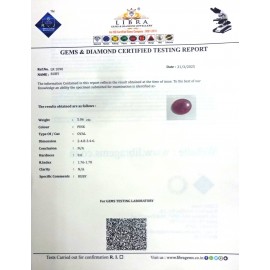 REPORT.NO.LR 546CLARITY.N/ACOLOUR.PINK SHAPE/CUT.OVAL WT.6.74 CTS DIMENSION.1.9-9.9-6.4R.INDEX.1.76-1.78HARDNESS.9.0 COMMENT.RUBY ..