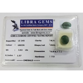 REPORT.NO.- LE 245CLARITY.-N/ACOLOUR.-GREENSHAPE/CUT.-OVALWT.-3.92 CTSDIMENSION.-9-8.8-7.7-1.R.INDEX.-1.57HARDNESS.-7.5COMMENT.-EMERALD..