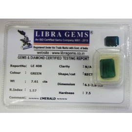 REPORT NO . LEJ 101CLARITY . N/ACOLOUR . GREENSHAPE / CUT . RECTANGLEWT . 3.56 CTSDIMENSION . 9-3.7-7.6-4.R . INDEX . 1.57HARDNESS . 7.5COMMENT . EMERALD { J }..