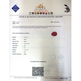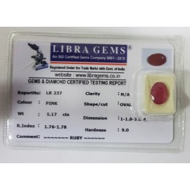 REPORT NO . LR 237CLARITY . N/ACOLOUR . PINKSHAPE / CUT . OVALWT . 5.17 CTSDIMENSION . 1-1.8-3.5-4.R . INDEX . 1.76-1.78HARDNESS . 9.0COMMENT . RUBY..