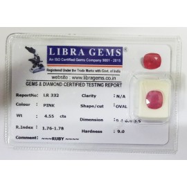 REPORT.NO.-LR 332CLARITY.-N/ACOLOUR.-PINKSHAPE/CUT.-OVALWT.-4.55 CTSDIMENSION.-9.4-8.6-5.5R.INDEX.-1.76-1.78HARDNESS.-9.0COMMENT.-RUBY..