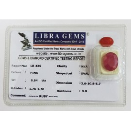 REPORT.NO.-LR 425CLARITY.-N/ACOLOUR.-PINKSHAPE/CUT.-OVALWT.-8.84 CTSDIMENSION.-3-6.10-8.5-7.R.INDEX.-1.76-1.78HARDNESS.-9.0COMMENT.-RUBY..