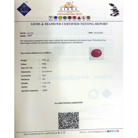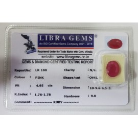 REPORT NO . LR 188CLARITY . N/ACOLOUR . PINKSHAPE / CUT . OVALWT . 4.95 CTSDIMENSION . 10-9.8-6.5-3.R . INDEX . 1.76-1.78HARDNESS . 9.0COMMENT . RUBY..